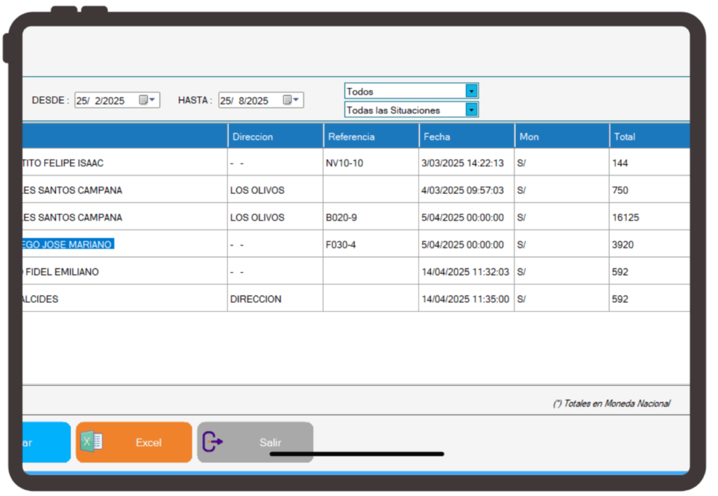 Historial completo de ventas con búsqueda por fechas.